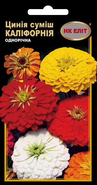 Цинія суміш Каліфорнія - однорічна рослина, з великими махровими квітами різних забарвлень . Рослина досягає у висоту 44-65см, і має квітки діаметром 7-10см. Ідеально підходить для клумб, рабаток та бордюрів. Вирізняється легкістю у вирощуванні та чудово прикрашає будь-який сад своїми великими і яскравими квітами. Рослинам потрібен полив, прополка, розпушування та підживлення.