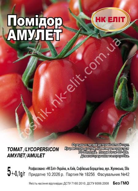 Помідор Амулет - Середньостиглий детермінантний сорт. Кущ висотою до 0,8м, на якому утворюється 70-80плодів. Плоди вагою 80-90г. Для консервування та переробки.