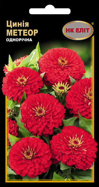 Цинія Метеор - Однорічна рослина, висотою 50-80см. Кущі розлогі, з міцними стеблами. Квіткові корзини діаметром від 8 до 15 см з широкими щільними язичковими і дрібними трубчастими квітками, махрові, червоного забарвлення. Квітує з липня до заморозків. Використовують на зріз, у вазах, озеленення, для клумб та садових ділянок. Вирощується висівом насіння у відкритий ґрунт в травні або для більш раннього цвітіння, через розсаду у березні-квітні.