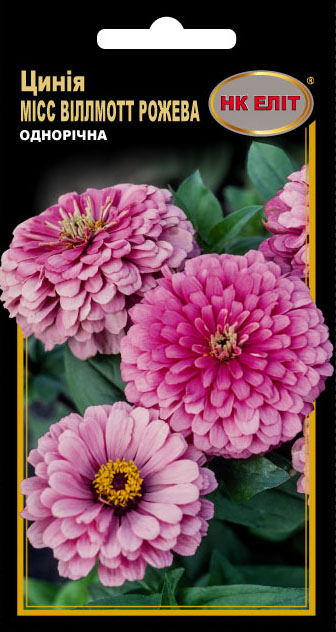 Цинія Місс Віллмотт Рожева - однорічна рослина, з великими махровими квітами рожевого кольору. Рослина досягає у висоту 44-65см, і має квітки діаметром 7-9см. Ідеально підходить для клумб, рабаток та бордюрів. Є чудовим вибором для яскравого оформлення саду. Рослинам потрібен полив, прополка, розпушування та підживлення.