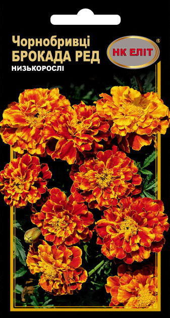 Чорнобривці Брокада Ред - сорт характеризується низькорослими кущами, висотою 15-20см та махровими червоно-бордовими квітами. Цвітіння рясне та тривале, з червня по серпень, до пізньої осені. Є популярним вибором для клумб, бордюрів та прикраси присадибних ділянок. Їх вирощують, як для декоративних цілей, так і для використання в народній медицині.  Рослинам потрібен полив, прополка, розпушування та підживлення.